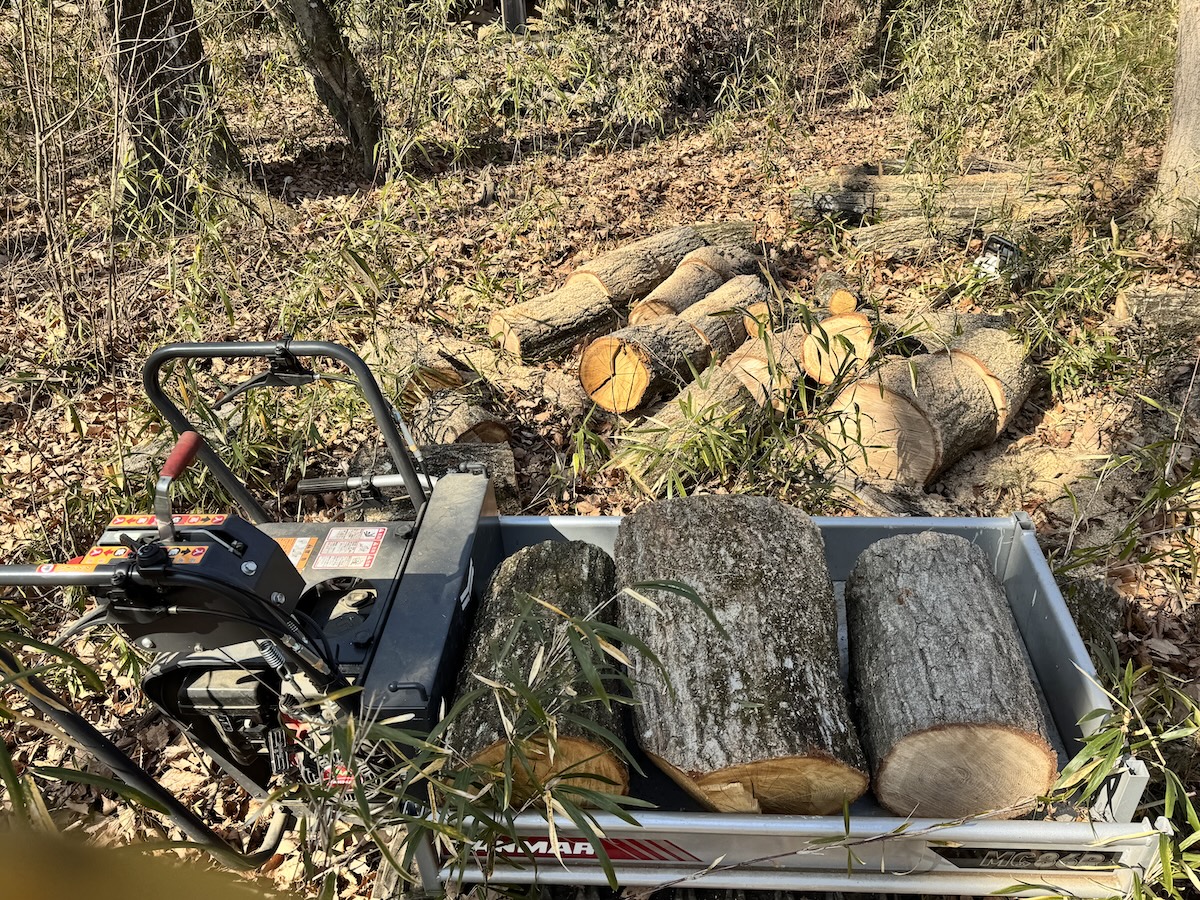 今週末は8MATOで、次のシーズンに備えて、薪の準備をしました。ナラ枯れの木を伐採し、その丸太を玉切り(薪の長さに切りそろえる)し真下。ただ、途中で運搬機がエンスト、修理を試みたもののどうしようもできず、目的を達成できずに中断しました。残ったのは、森の中に残された丸太と腰や腕、太股の痛みという、なんとも残念な状況です。今この記事を書きながら、じんわりとした腰と腕の痛み、そして怠さを感じています。
