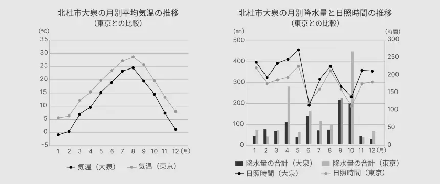 8KUMO のある八ヶ岳南麓・標高1000mの北杜市大泉町は、都心よりも気温は5〜6度ほど低く、真夏でも低湿度の気候です。木陰に入れば汗もすっと引き、夜はエアコンなしでもぐっすりと眠れます。また、日照時間日本一という恵まれたエリアでもあり、真冬でも晴天の日の陽向は、暖房なしで過ごせる日も多く、過ごしやすい気象条件です。