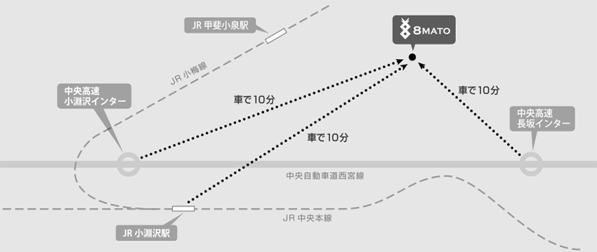 ■ 自動車:新宿~中央高速道路~長坂インター(約 2 時間)を降りて10 分程度(約 5km)